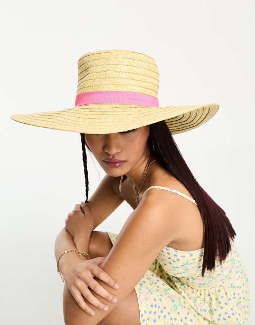 Pieces straw hat in natural with pink ribbon