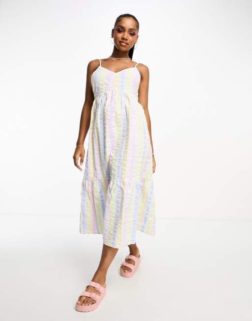 Pieces textured v-neck smock midi dress in pastel stripe