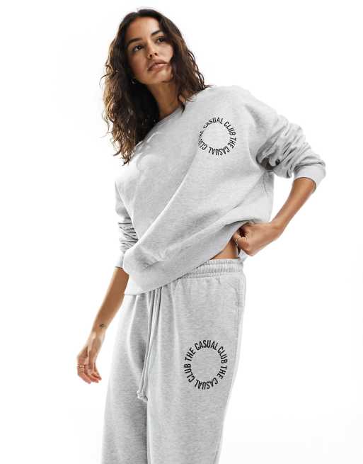 Pieces 'the casual club' slogan sweatshirt co-ord in grey