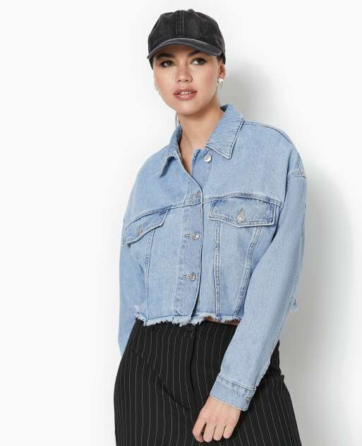 Pimkie cropped oversized denim jacket with raw hem in light wash blue