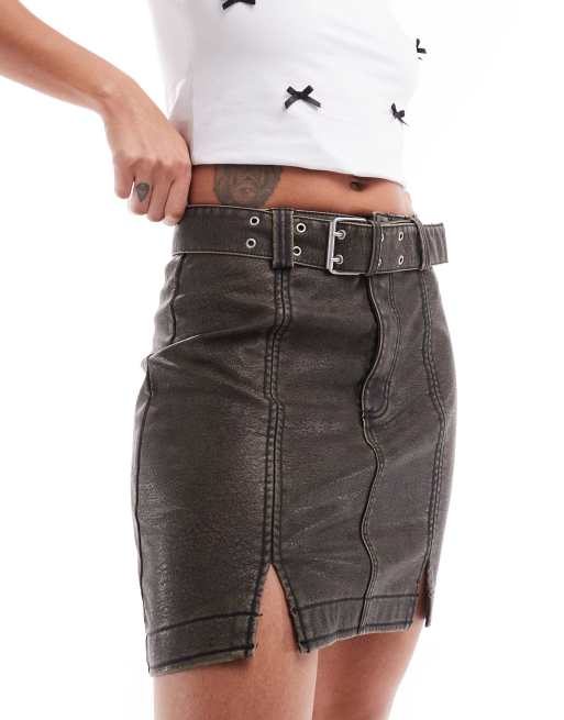 Pimkie distressed leather look belted mini skirt with front splits in brown