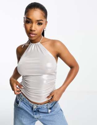 Pimkie metallic shiny halterneck top in silver