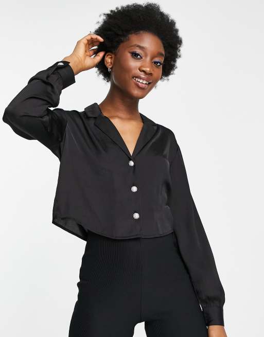 Pimkie rhinestone button satin shirt in black