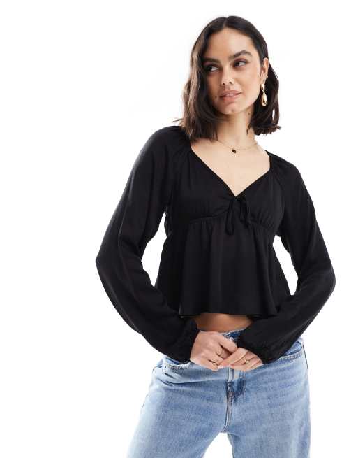 Pimkie tie front long sleeve peplum top in black