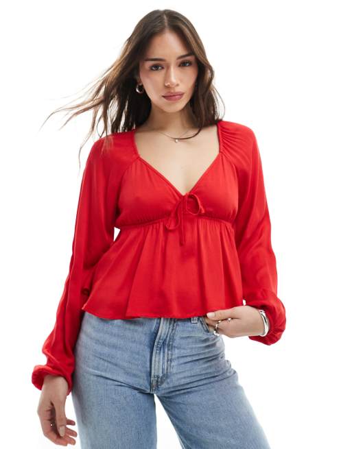 Pimkie tie front long sleeve peplum top in red