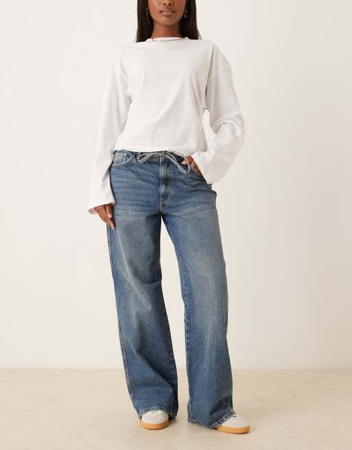 Pimkie tie front mid waist wide leg jeans in mid blue denim