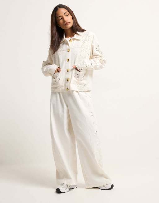 PixieGirl Petite embroidered wide leg trousers in white