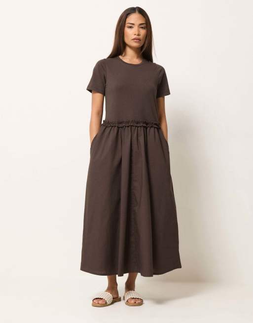 PixieGirl Petite mixed ruffle maxi dress in brown