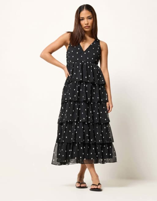 PixieGirl Petite polka dot chiffon midi dress in black