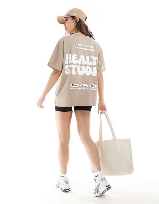 4505 – Gruby T-shirt oversize w kolorze kawy z mlekiem z napisem „Health Studio” na plecach