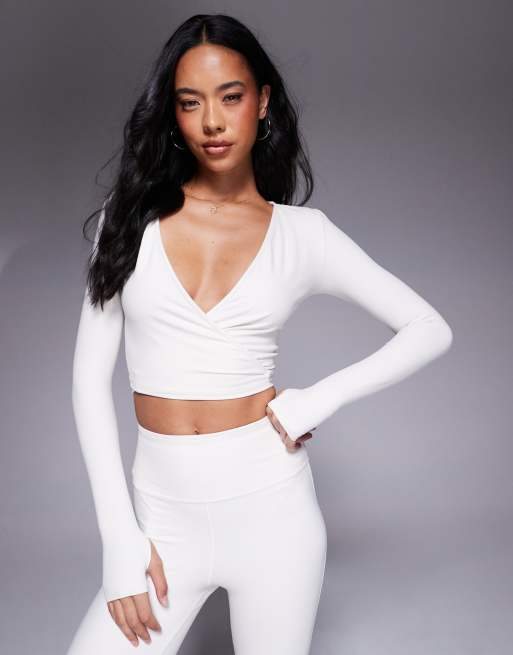 4505 – Kremowożółty miękki baletowy top z kopertowym wiązaniem i długimi rękawami