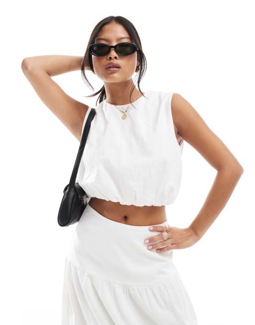 4th & Reckless Petite – Biały profilowany bufiasty top o krótkim fasonie z popeliny, część zestawu