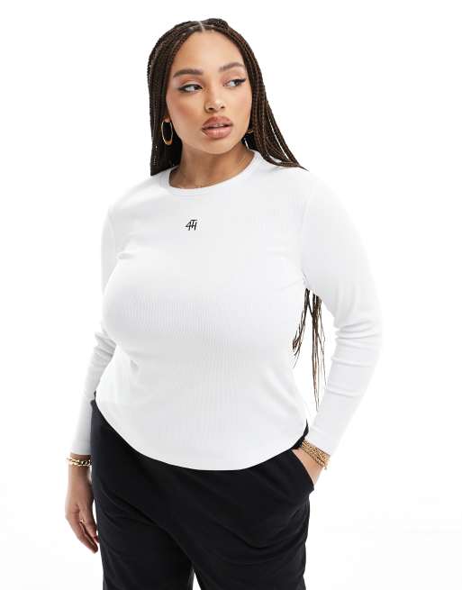 4th & Reckless Plus – Biały prążkowany top z długim rękawem i haftowanym logo