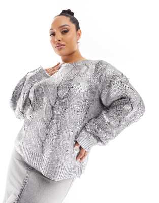 4th & Reckless Plus Exclusive – Srebrny metaliczny sweter z dzianiny o warkoczowym splocie