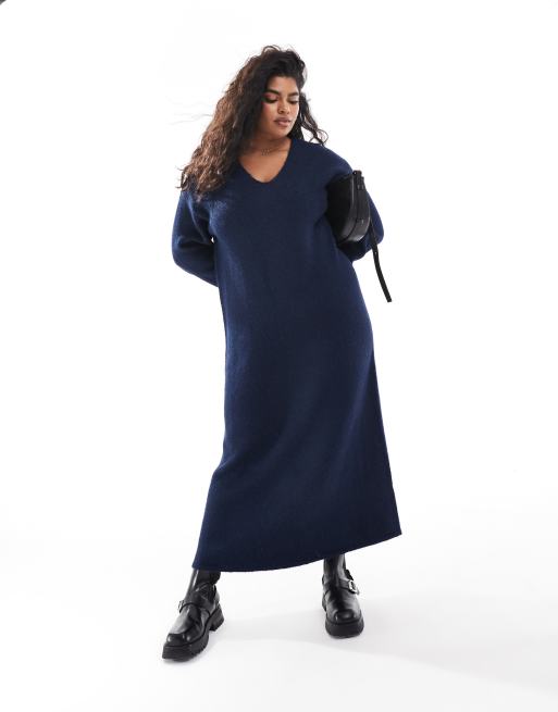 4th & Reckless Plus – Granatowa sukienka maxi z dekoltem w szpic z puszystej dzianiny z domieszką wełny
