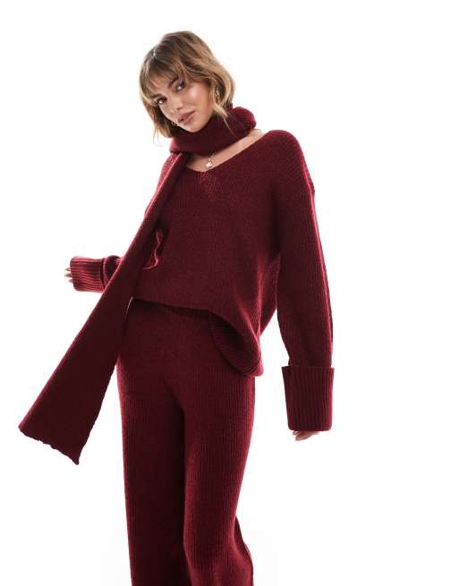 4th & Reckless – Bordowy sweter z szerokimi mankietami, dekoltem w szpic i szalikiem, część zestawu