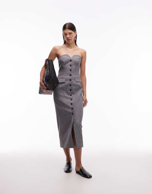 4th & Reckless – Szara elegancka sukienka midi z dekoltem bandeau, imitacją kieszeni i zapięciem na guziki