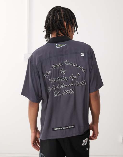 AAPE By A Bathing Ape – Ciemnoszara koszula w stylu roboczym z krótkim rękawem i haftowanym wzorem na plecach