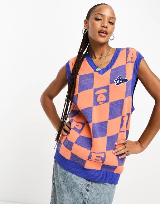 AAPE By A Bathing Ape – Dzianinowy podkoszulek oversize w niebiesko-pomarańczową kratkę
