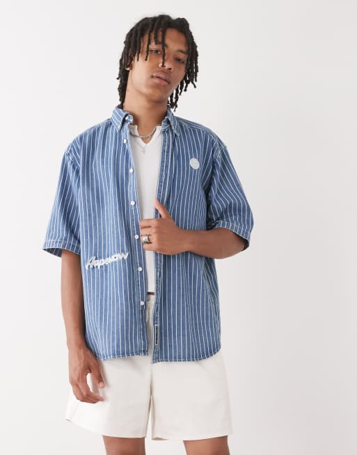 AAPE By A Bathing Ape – Sprana niebieska koszula z krótkimi rękawami o luźnym kroju w paski