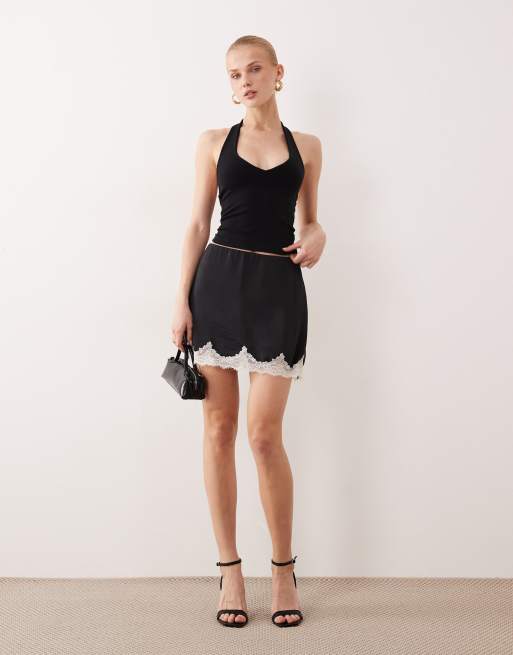 Abercrombie & Fitch – Czarne satynowe spódnicospodnie mini z koronkowym wykończeniem