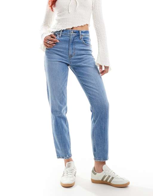 Abercrombie & Fitch – Niebieskie mom jeans z efektem sprania