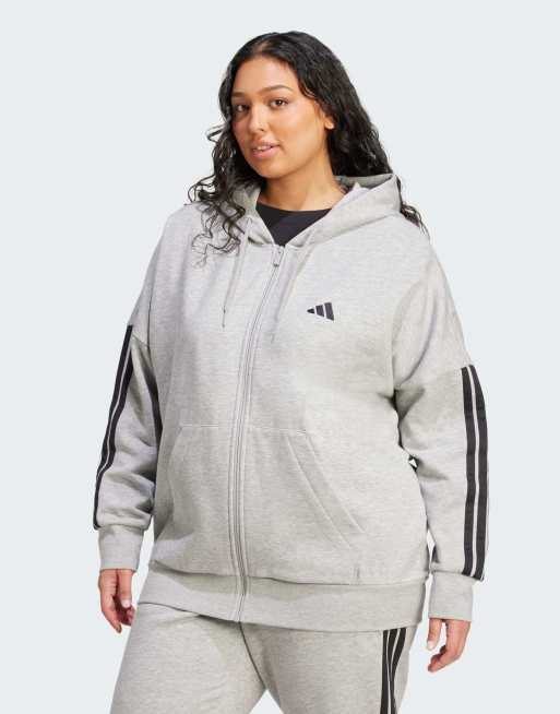 adidas Performance Plus Size – Essentials – Szaro-czarna bluza z kapturem z polarowym wykończeniem i 3 paskami