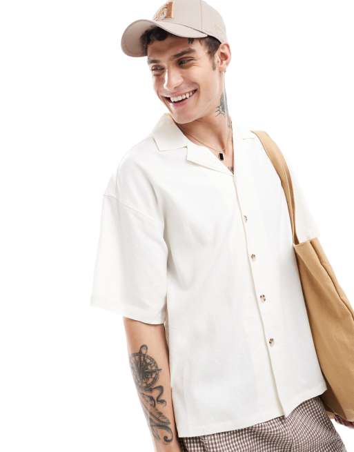 ADPT – Biała koszula oversize z kołnierzykiem kubańskim z domieszką lnu