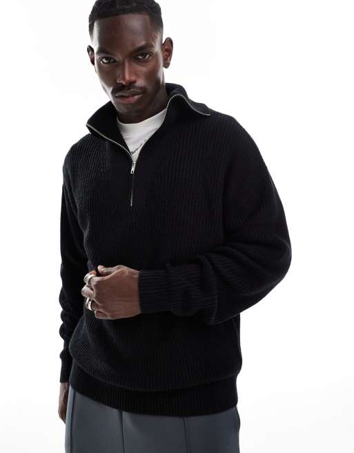 ADPT – Czarny sweter oversize z dzianiny o splocie patentowym z golfem i zamkiem pod szyją