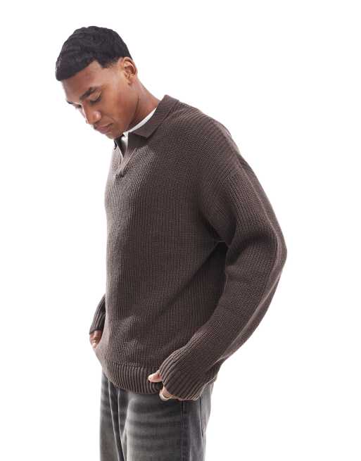 ADPT – Prążkowana czekoladowobrązowa koszulka polo oversize typu fisherman