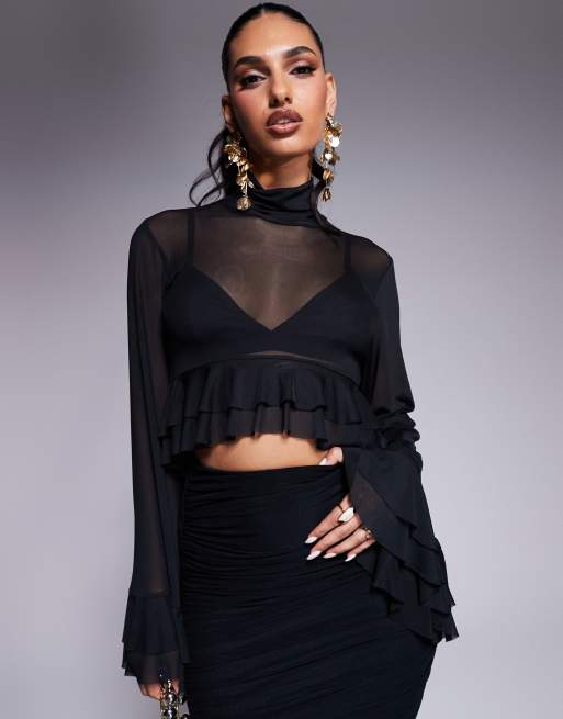 AFRM – Pru – Czarny siateczkowy top z falbankami i golfem, część zestawu