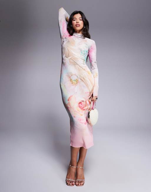 AFRM – Różowa sukienka midi w kwiatowy wzór z długimi rękawami i golfem
