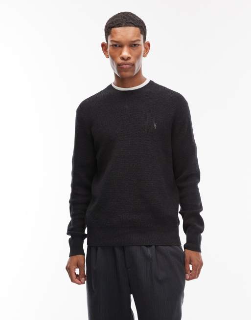 AllSaints – Czarny sweter z dzianiny o fakturze wafla z okrągłym dekoltem i logo