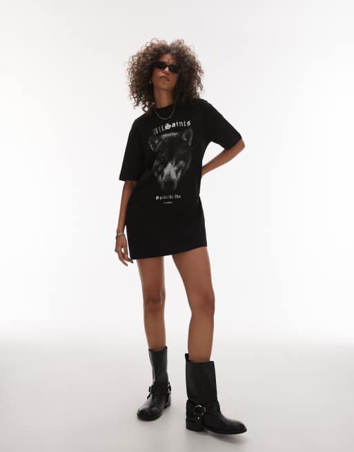 AllSaints – Dawn – Czarna sukienka t-shirtowa z grafiką wilka