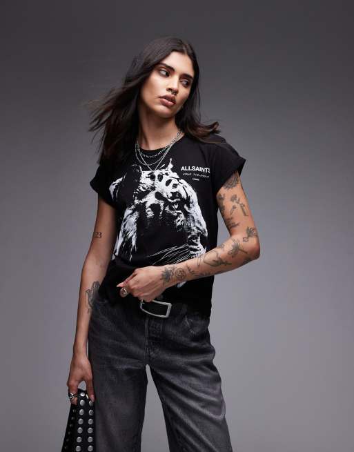 AllSaints – Ivana – Czarny T-shirt z grafiką z tygrysem