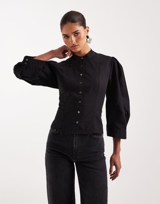 AllSaints – Maud – Czarna sznurowana koszula ze sznurowanym gorsetem i balonowymi rękawami