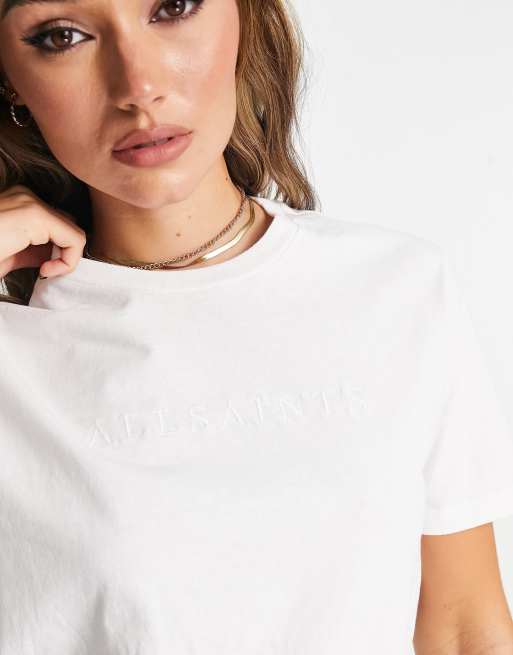 AllSaints – Pippa – Biały T-shirt o fasonie boyfriend z haftowanym logo