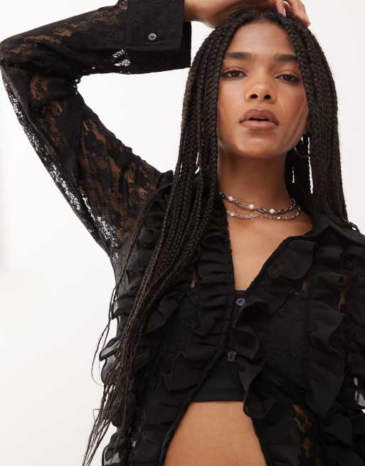 Amy Lynn – Czarna koronkowa koszula z falbankami