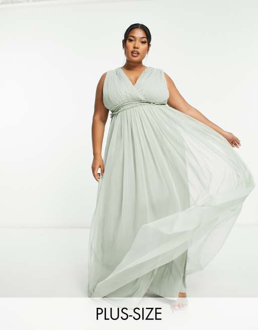 Anaya Plus Bridesmaid – Szałwiowozielona sukienka maxi z dekoltem w szpic i falbanka w talii