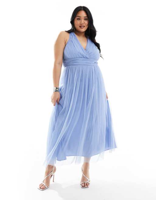 Anaya Plus – Jasnoniebieska kopertowa sukienka midaxi z odkrytymi plecami