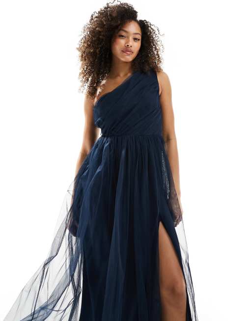 Anaya Bridesmaid – Granatowa tiulowa sukienka maxi na jedno ramię