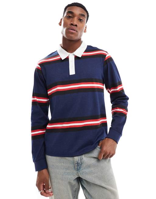 Another Influence – Granatowa koszulka polo z długimi rękawami w paski