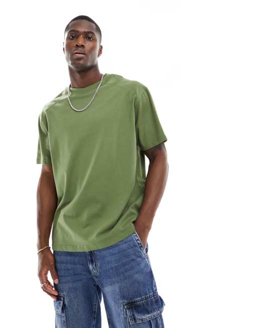 Another Influence – Gruby T-shirt oversize w spranym kolorze khaki z ozdobnymi szwami