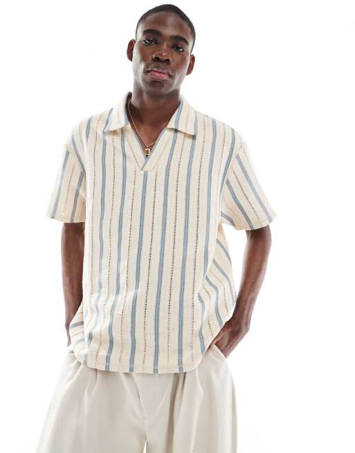 Aray – Kremowo-niebieska plażowa koszula szydełkowana z kołnierzykiem polo i wzorem w paski