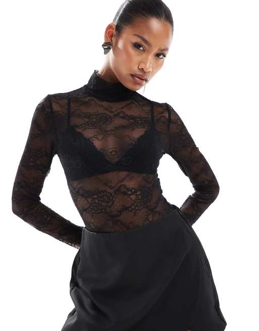 Aria Cove – Czarne koronkowe body z golfem i długim rękawem