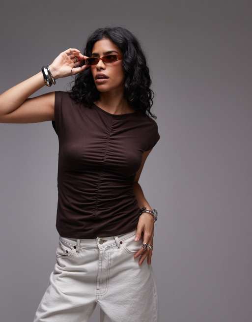 ARKET – Brązowy T-shirt z marszczeniami z dużą zawartością bawełny