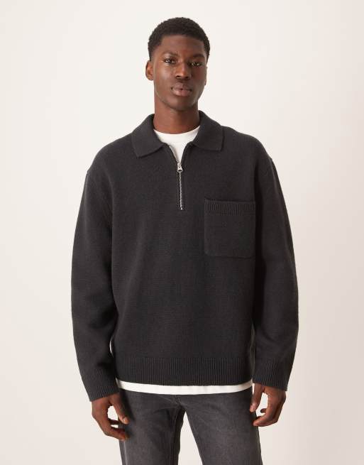 ARKET – Czarny wełniany sweter oversize z kołnierzykiem polo, efektem sprania i suwakiem pod szyją