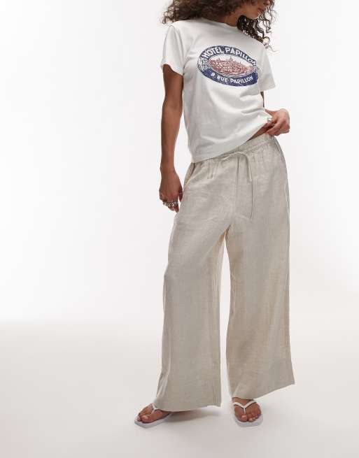 ARKET – Jasnobeżowe ściągane na sznurek w talii spodnie o krótkim fasonie z lnu