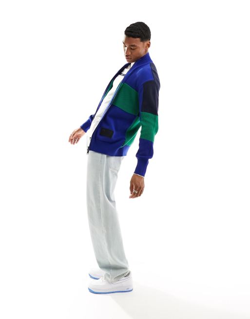 Armani Exchange – Zapinany na suwak dzianinowy sweter z niebieskimi i zielonymi blokami kolorów
