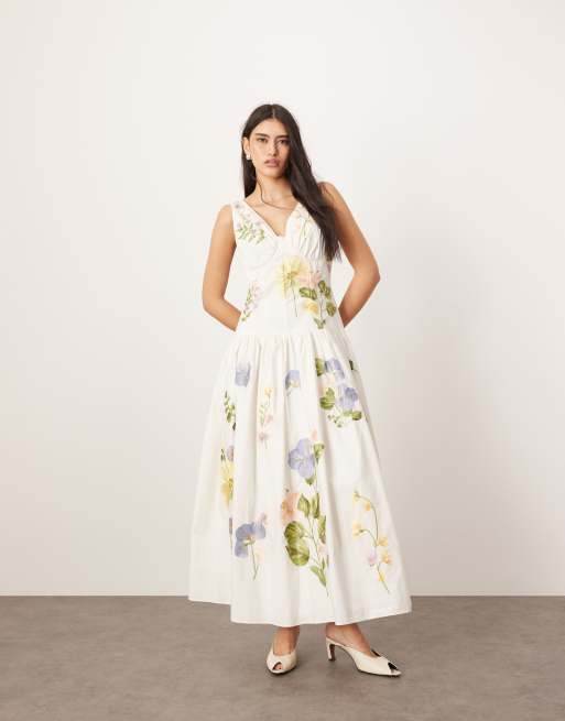 ARRANGE – Biała bawełniana sukienka gorsetowa maxi z kwiatowym wzorem i haftem